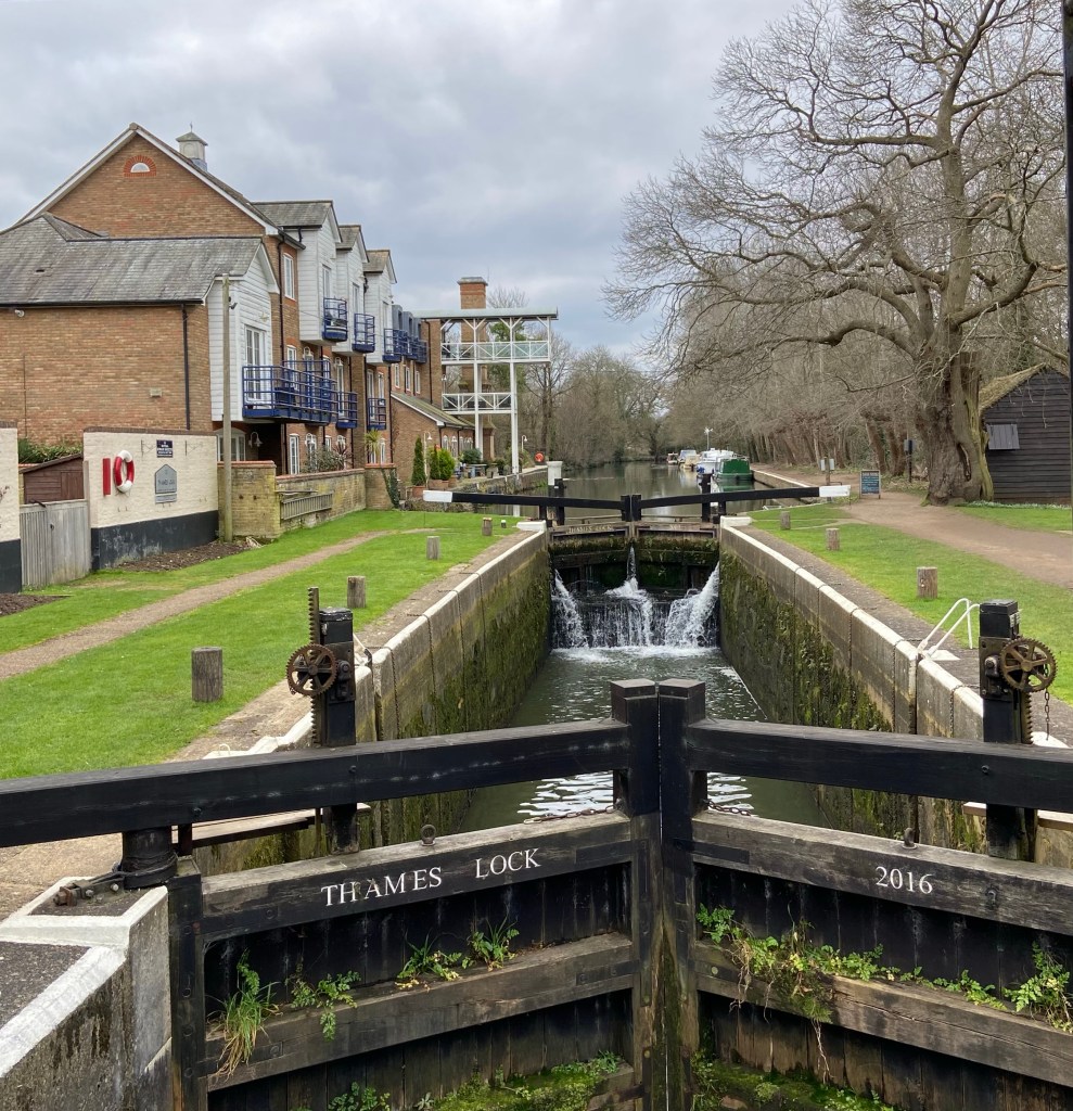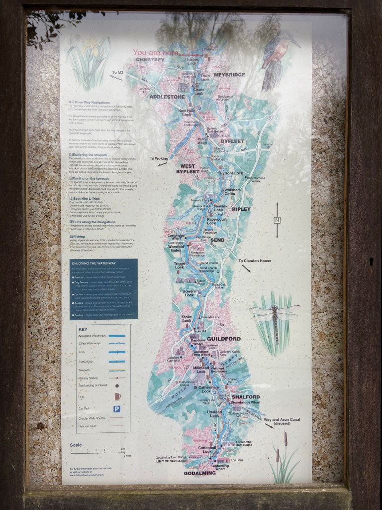 After an extremely comfortable night chez Susie I walked out to the start of the Navigations at Thames Lock over Whittet’s Ait, the first of many islands I would walk over today. The lock gives the first sense of the history which is present along the whole length of this 20-mile navigable waterway, from the Thames to Godalming.