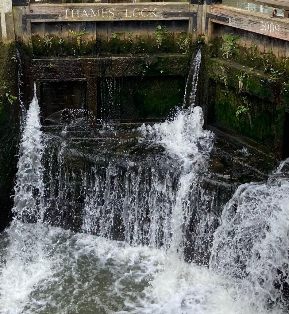 But some of the gates have been replaced to create a passable channel for the fish. I stood a while to watch the textures and shapes made by the water, thinking how these were just the latest in nearly five centuries of diversions and channels and various other engineering projects since the first locks were built on the Wey in the sixteenth century.