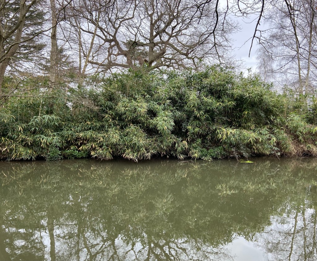 Although we were out into the land beyond the encircling embrace of the M25, I soon became very much aware of the urban context of Byfleet. Pylons reared their heads above the bare oak trees, and the unbroken roar of the traffic in the background was not so muted. Incongruous stands of bamboo masked the bank of the Navigation.