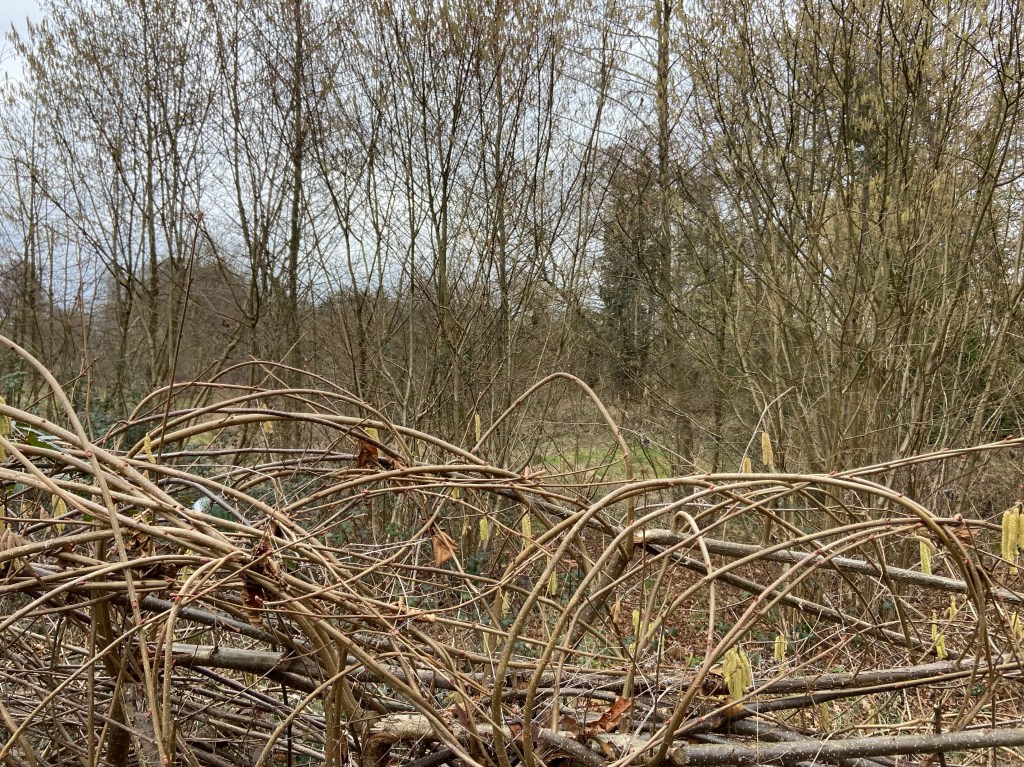 The Wisley golf club straddled both sides of the river, making the waterway one hell of a hazard. Somewhere around here lay RHS Wisley, but there was nothing to be seen of the gardens, probably not at their best at this time of year — and in any case, I wouldn’t have had time to visit properly. But, while I was thinking about flora, I did appreciate the occasional extravagant artistry of the wattle-builder