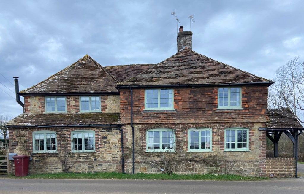 The track passed several cottages in the local vernacular, vertical clay wall tiles on the upper part of the building. This practice started in these southern counties in the 17th century s both a response to a brick tax, and also as a solution for weatherproofing wattle and daub walls in timber-framed buildings where brick infill was too heavy for the upper storey to sustain. Furnacepool Cottages had what are my father would have called an ‘attractive combination’ brick and local yellow sandstone walls as well as the old clay roof and vertical wall tiles. There were also the historic remains, marked on the map in Gothic script, of the furnace pond next to the cottages.