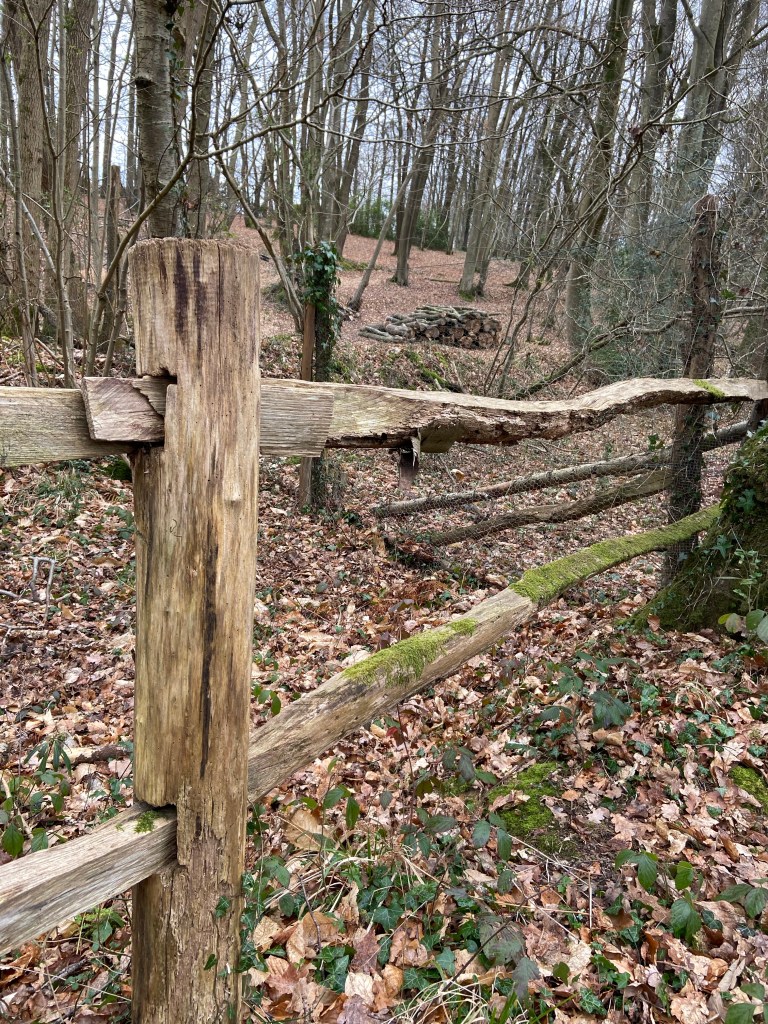It was to be ages until I was to reach the canal or river again. Instead, the Wey South Path offered me a perfectly pleasant country walk. There were dormant oak and chestnut copses, marked out by chestnut railings.