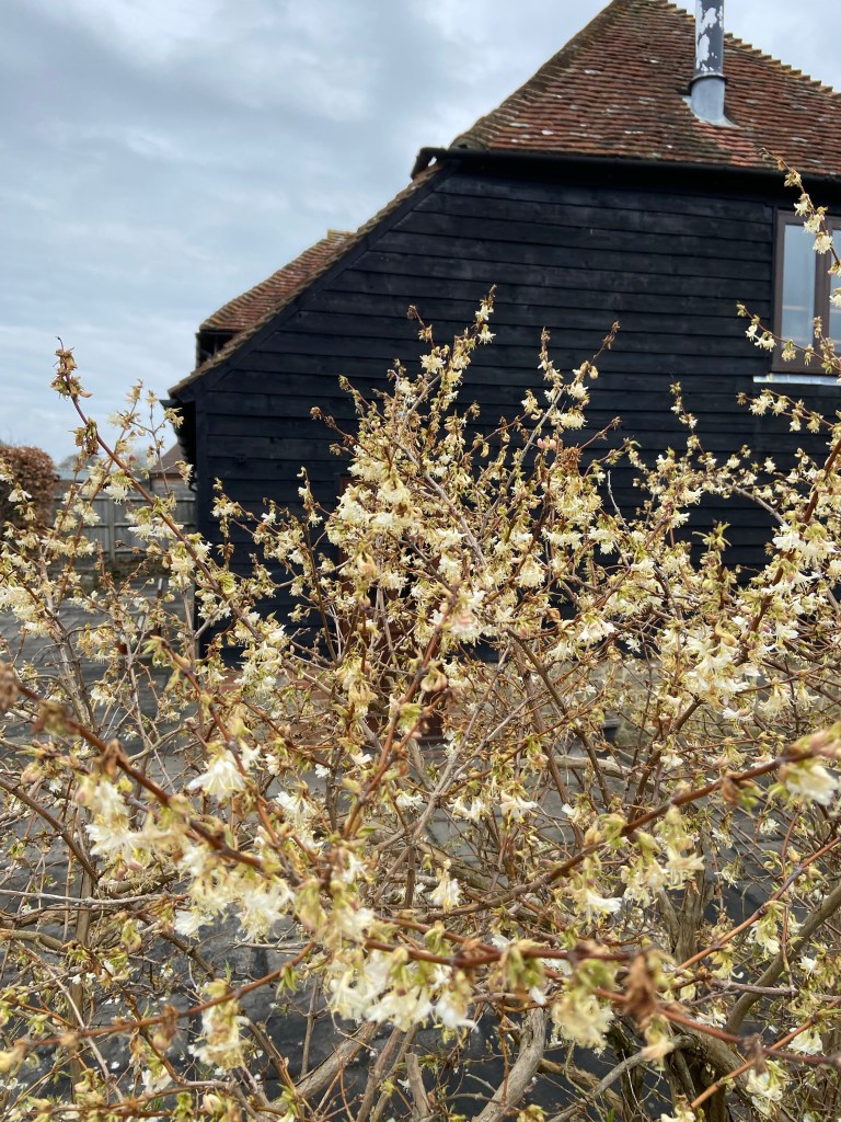 Although in other places the natural world seemed to chime beautifully with the built environment, as with this powerfully scented winter honeysuckle against the dark boards of a new-build timber-framed house: