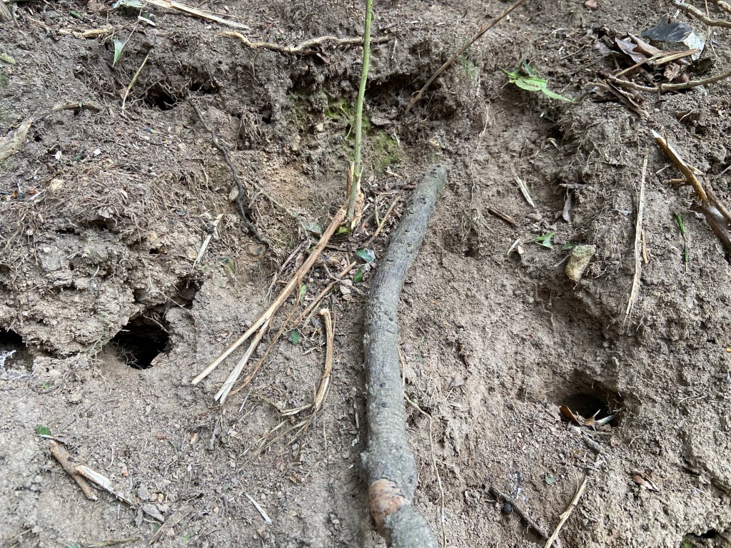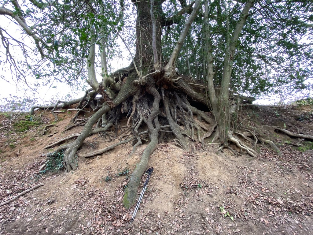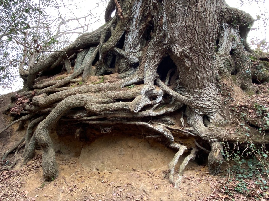 More erosion of the sandy banks over decades had exposed the roots of a row of huge oaks and turned the root systems into a lattice of treetrunks.