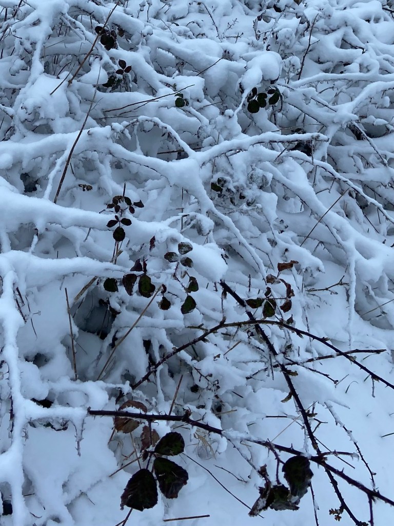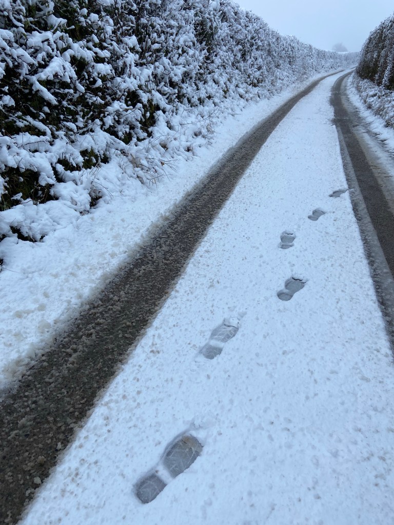 I was riveted as much by the transformation of the track on the ground as by the hedgerows. The snow held the story of the last hour or so in the prints and tracks and whilst I was on my own I felt some kind of interested connection with the person who had preceded me. Vehicle tracks had obscured footsteps, but it soon became apparent that there had been two walkers, with a dog, and that birds had also cross-crossed the tracks before or afterwards, looking for food.