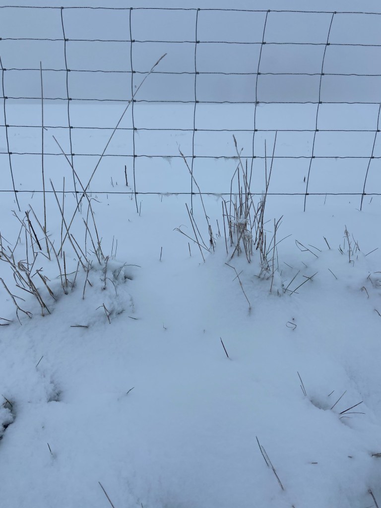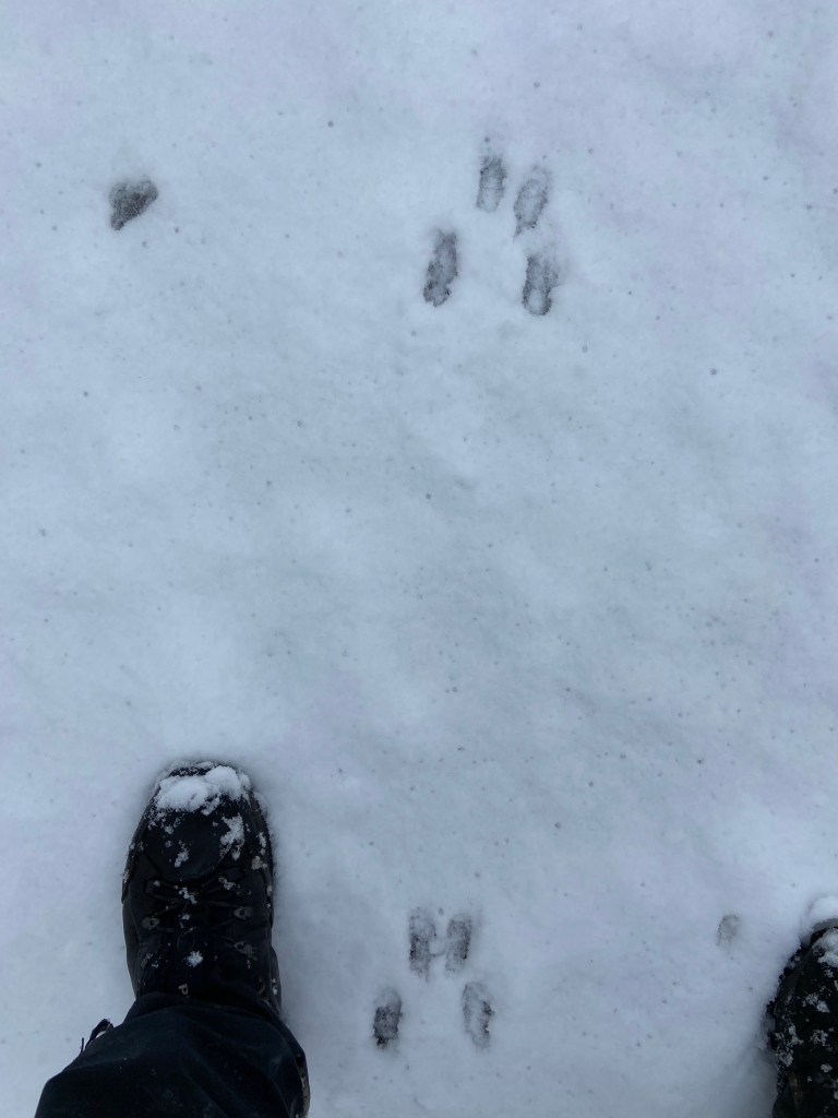 I had been surprised not to have seen any deer tracks up to this point. I now saw some, just visible in the pock-marked snow and slowly losing their identity — and that was just after I’d come across the lower leg of a deer, small neat hoof included, on the slushy track.
