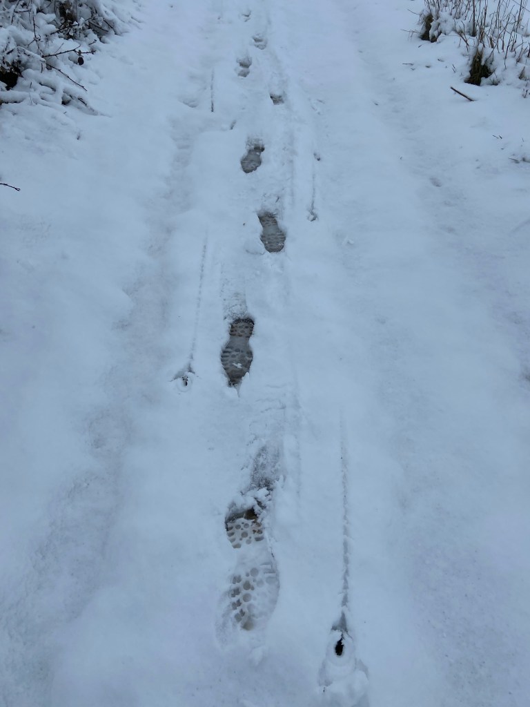 Looking back, the sight of my own footprints was reassuring: proof of two feet walking at a steady pace, supported by sturdy poles.