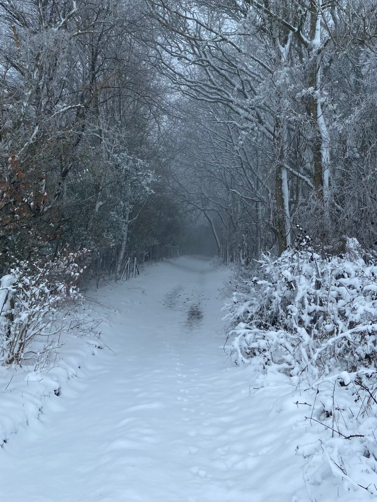 I met a countryside ranger — one of only three people out on the path today whose walk intersected with mine — a young woman glowing with exertion after slogging up a track from Bepton about 2km into my path from Cocking. She hadn’t been able to get into work because the road was closed, so she’d come out on a walk to see the Downs in the snow. I asked her whether the the tracks I was seeing were hares or rabbits and she said that the rabbits locally were ‘magnificent’.
