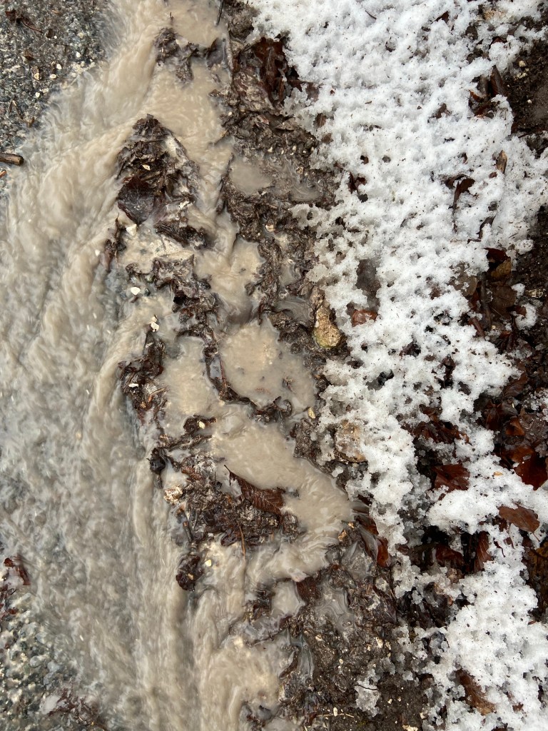 And then I was back out into farmland. Two hours and a few tens of metres of altitude had brought the world back into the plane of the ordinary. This time with slush and muck and a succession of swamps of freezing brown water. Where the track was stony the water had run freely down the slopes and filled the ruts to overflowing.