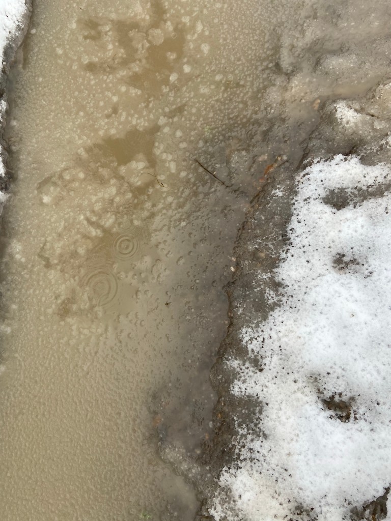 Farm vehicles had churned up meltwater into huge puddles on the surface of which slush floated sluggishly in a dirty layer.