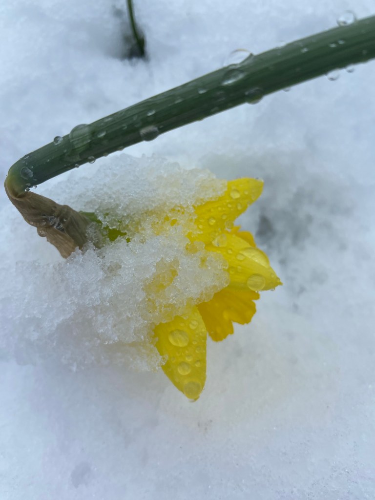 There was scattering of snow first thing in Petersfield, so we left a little early for the village of Cocking where yesterday I had photographed the daffodils in the single gleam of sun which shone on me as I waited on the bench by the bus stop. Today was a different picture entirely.