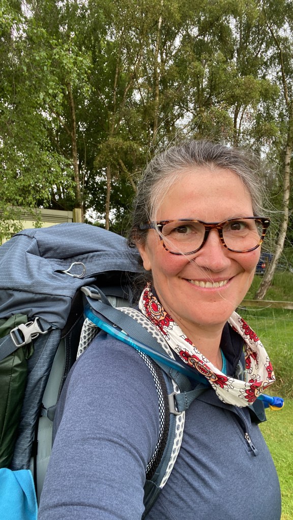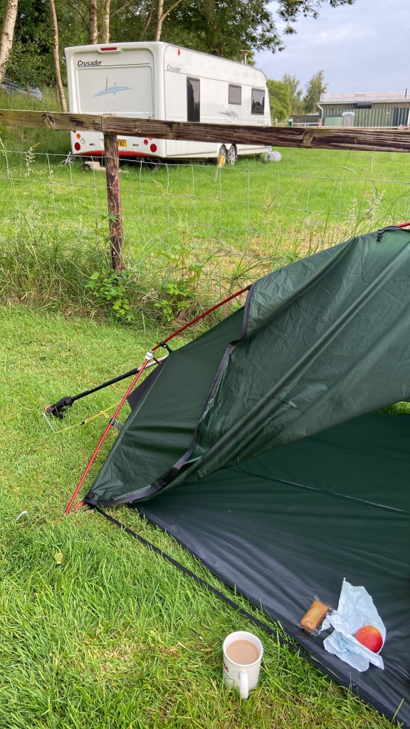 I don’t know whether it was the coffee I had yesterday afternoon, or the general clamminess of the air (the shower had been too disgusting to even think of using), but I could not get to sleep. I perhaps slept for 10 minutes between 4.00 and 4:30am, but otherwise I lay awake. I had set my alarm for 6.00 wanting to be away by 7.00, but I got up at 5:30 anyway, and started to pack up. Brenda appeared at my tent flap to offer me a coffee or tea, the absolute sweetheart. I gratefully accepted a coffee, and she returned 5 minutes later, with a steaming cup, a little cake, and an apple. I told her I would put those in my pocket for later, and eat them when I got tired or hot, and I would think of her and thank her. What immense kindness so early in the morning!