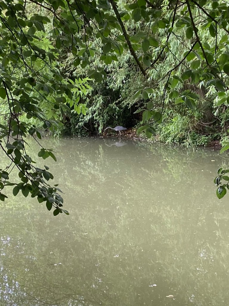The path was firm and overarched with crabapple and sprays of dog rose. The early morning creatures were not as shy as they might be later. Or perhaps it just seemed that way because I did not have to focus 100% of my attention on the path, and could look ahead and out over the water, and observe what was around me. Two young blackbirds were fighting like dogs on the path ahead and didn’t notice me until I was almost upon them. And a heron stood absolutely motionless in a hunting attitude on the other side of the canal in the shadows. He watched me warily as I passed, but did not move.