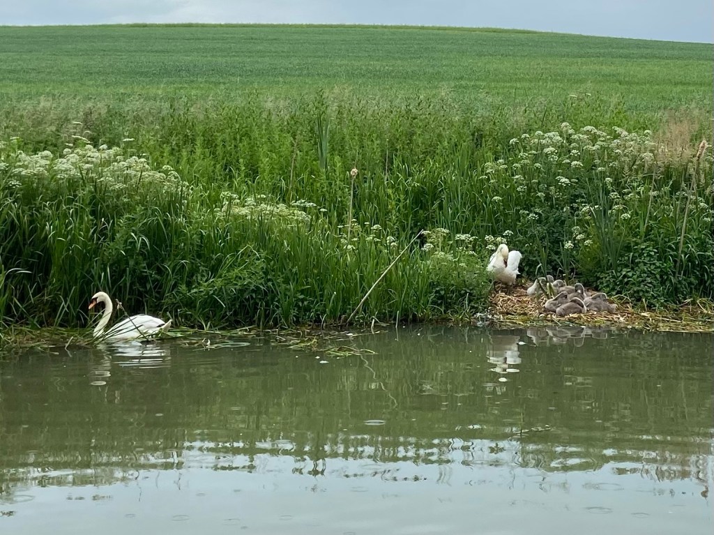 Approaching Blisworth/Gayton Junction, I saw a swallow skimming over the water at last. A few moments later, three others joined her, chattering noisily. A coot crossed the canal in front of me, carrying what looked like a piece of wet reed in his beak. Sure enough, he was carrying it to a nest on the far side away from the tow path. The female coot had all her plumage fluffed up and looked enormous. The male offered her the reed, but she testily flung it back at him when he tried to add it to the nest. This dynamic went on back-and-forth for some moments until she got up, launched into the water, and swam away. He climbed onto the nest to take his turn, and tucked in his piece of reed where he wanted it, as a tiny black cootling nestled itself back in.