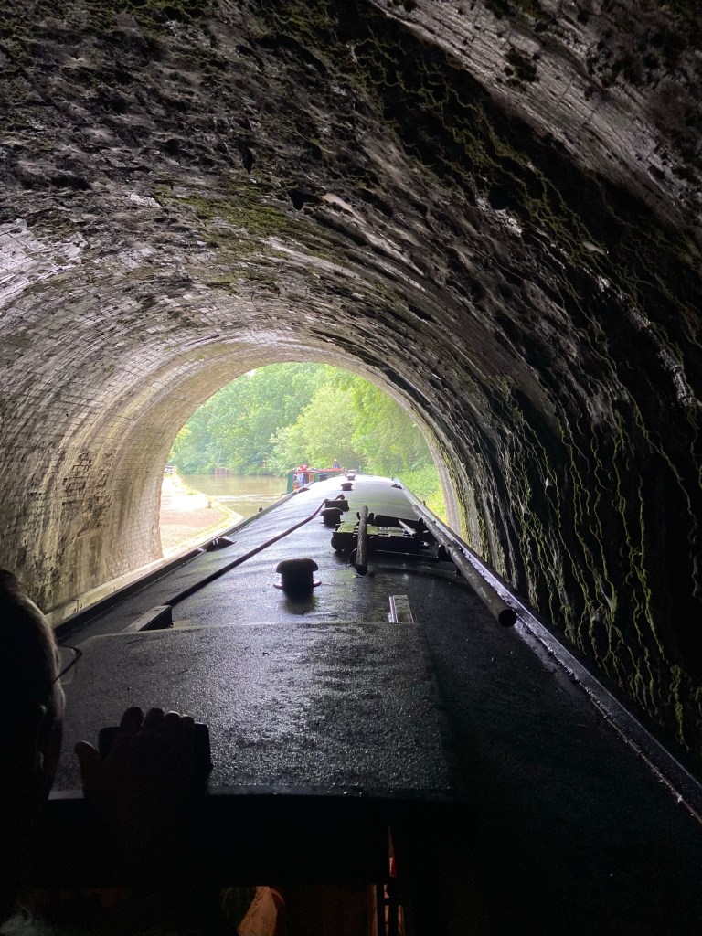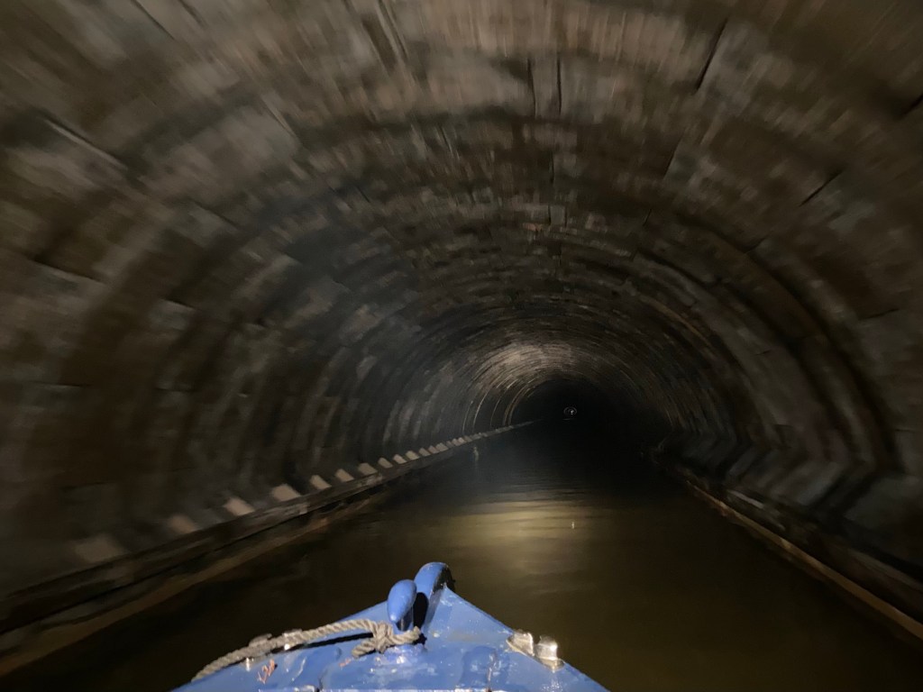 The tunnel was completely dark, lit only by the boat’s lamp and the dwindling light of another boat ahead. The photographs magnified what light there was and make it seem as though it was brighter — but it really was pitch black. There were no other boats coming the other way, which was lucky, because, as Andy told me, there is a 4-inch clearance between narrowboats in this 15-foot wide tunnel.