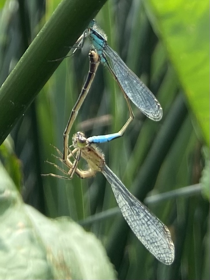 And because it was a charmed day, two damselflies alighted on a reed next to me, he clasping her just behind the head with the pincers at the end of his tail, and she bending her entire body upwards to meet his.