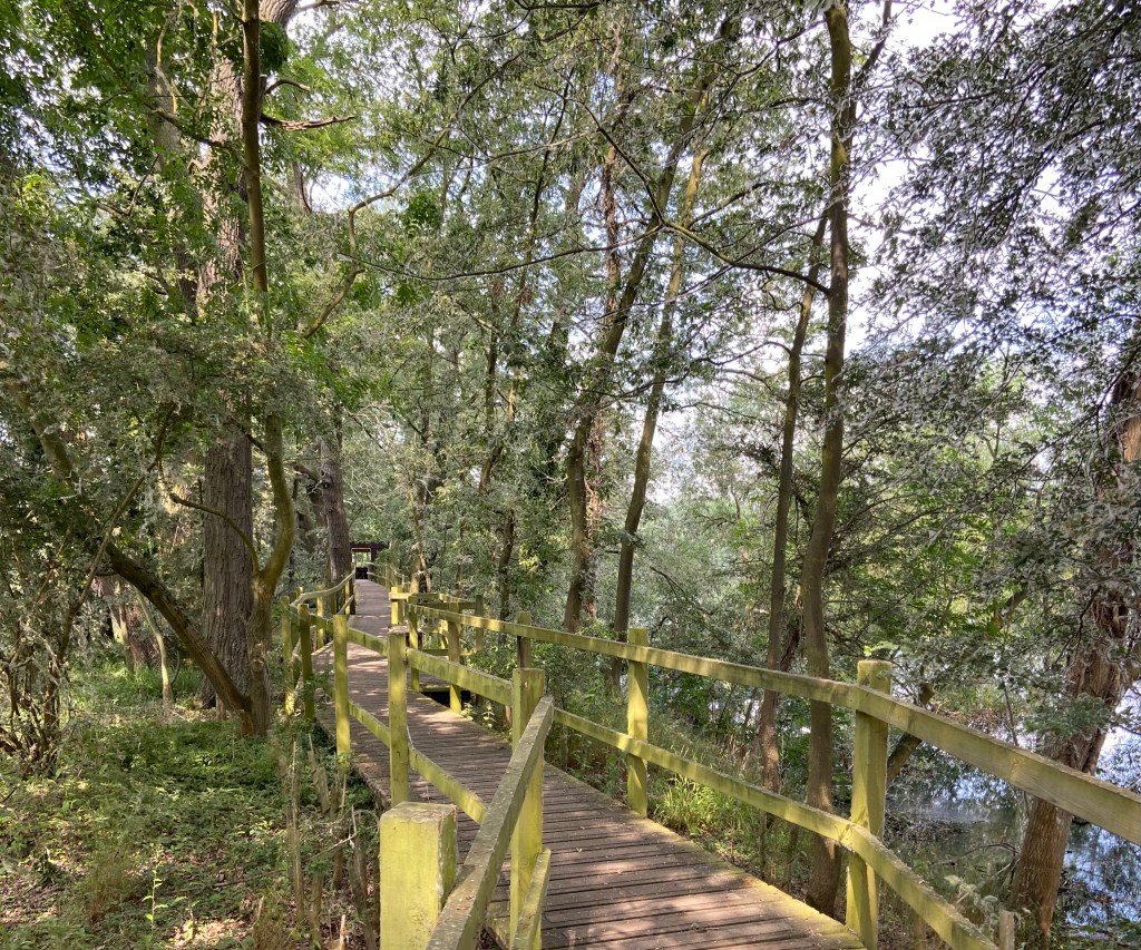 I needed to detour off the route and find a pharmacy to supply me with cream to put on these bites as soon as possible. There was one, in the middle of the village of Little Paxton, from where I could get back out to the Paxton Pits reserve as I had planned. While I applied the cream and swallowed a pill right there in the pharmacy, the pharmacist told me not only that there was something of a horsefly problem in the area at the moment (which fact I had independently discovered for myself), but also that there was a nasty stretch of the forward route where the ground was pretty unstable because it flooded so much, and was overgrown and weedy. This was useful intel, so I changed into the long trousers that I had (fortuitously) put into my pared-down pack today. As well as giving me some protection from the nettles, it would also deter horseflies.