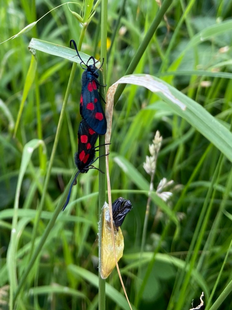 and six-spot burnet moths feeding on knapweed nectar and engaged in other activities.