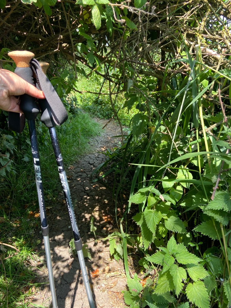 On the other side of the gate outside of the blasted meadow was a huge field of very interested cows. I am so much more frightened of horseflies than I am of cows, so I just opened the gate and barged straight through the cows and their calves. One cow trotted smartly along on the other side of the drainage ditch keeping pace with me as I strode towards the road, and as soon as she found the opportunity she crossed the ditch at a dried up section, and had a go. I brandished my poles threateningly, and made repressive noises, which stopped her in her tracks. Thank God for poles. I looked back later to see that she and a tiny calf standing thigh-deep in the ryegrass were gazing at each other… so she probably considered that she had seen off a calf-rustling intruder. But in reality the horseflies had seen to that.