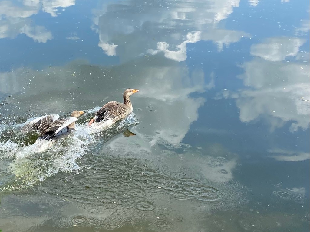 A pair of cormorants heaved themselves noisily into the air at my approach, the splashes of their take-off punctuating the water like skimming stones in reverse. A goose floated in an almost perfectly reflected sky,