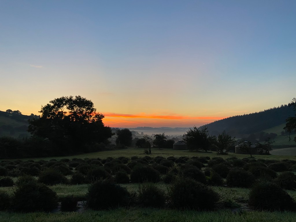 I woke several times in the night to the sound of owls. I had left the tent flap propped open with my walking pole, partly to try and reduce condensation, and partly for the views of the sunrise to the east. The night was equally lovely, though: a bright moon, quite enough to cast moonshadow, and many stars. There was enough light to see all the way down the silvery valley. Having fallen asleep at about half past eight last night (!) I was awakened properly this morning just after four by a wren singing in the hedge behind me. Not long afterwards an extraordinary chorus started up. Paul later told me it was peacocks down in the valley; the honking was like nothing I had ever heard. The dawn was absolutely beautiful, and I watched the low, fiery line of red, pink and purple lighten and the mists start to evaporate. It took me quite a while to finish the blog post for yesterday because I was simply drinking in the view.