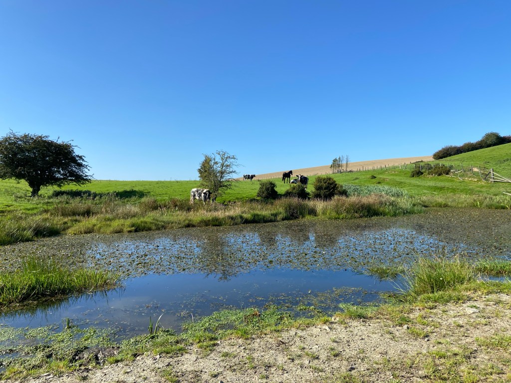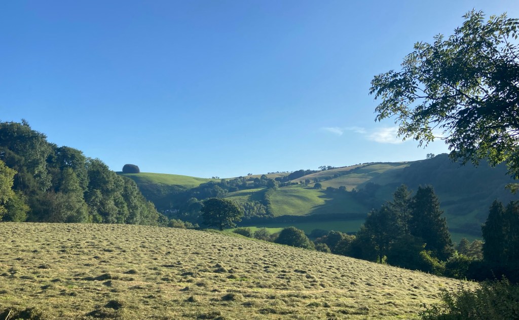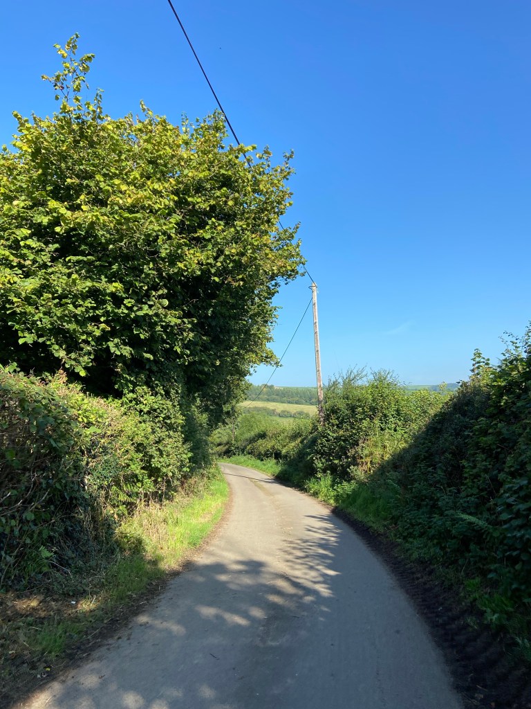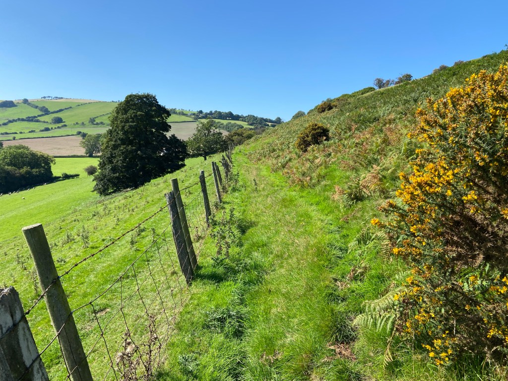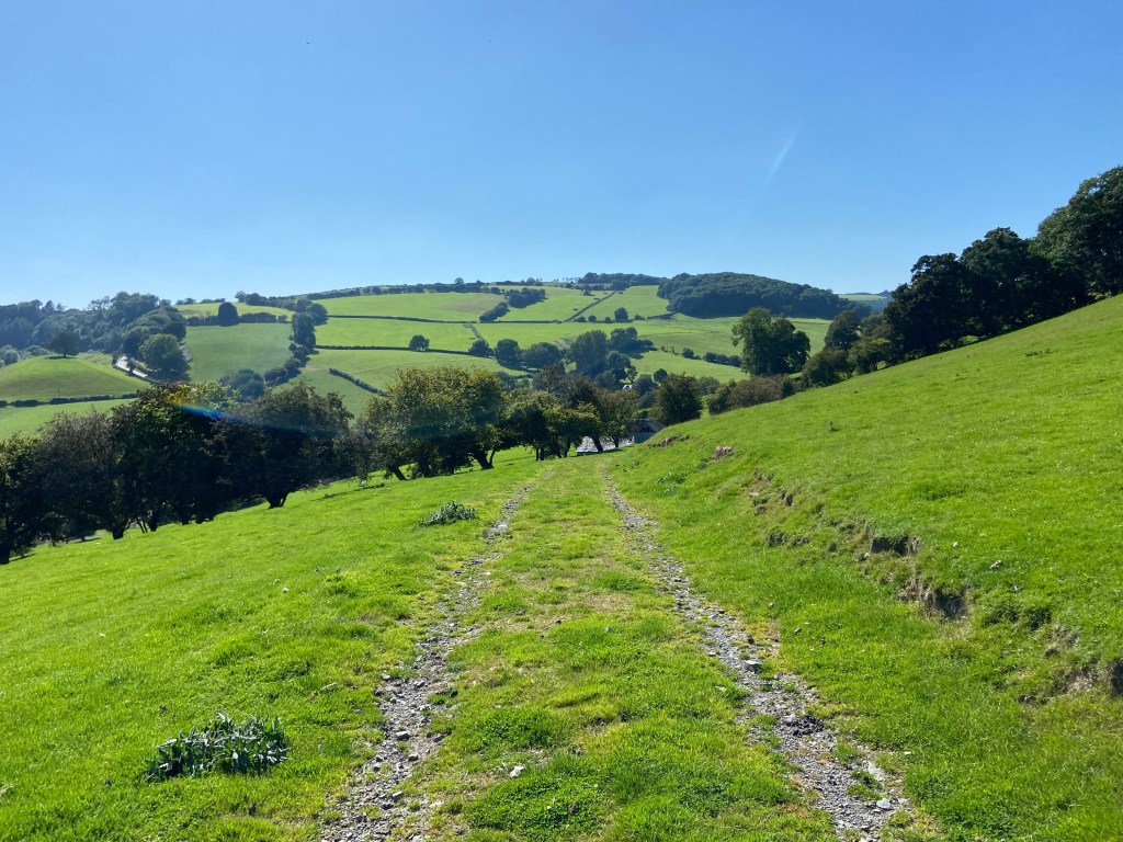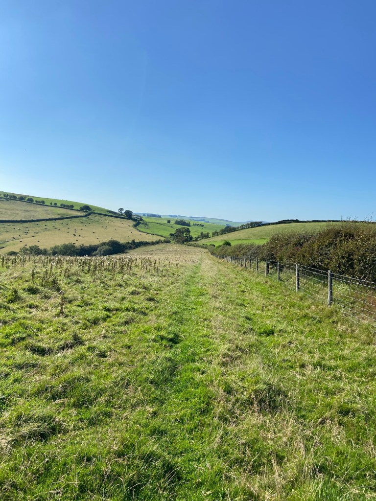 Although I was listening to the audiobook (mainly because O’Farrell’s Hamnet is a cracking novel, but also slightly because I had run out of water and wanted to distract myself from the fact), I kept my attention on the track, and the views. This was terrific walking, and very lovely: the light on the contoured fields looking west to where the sun had started to dip,