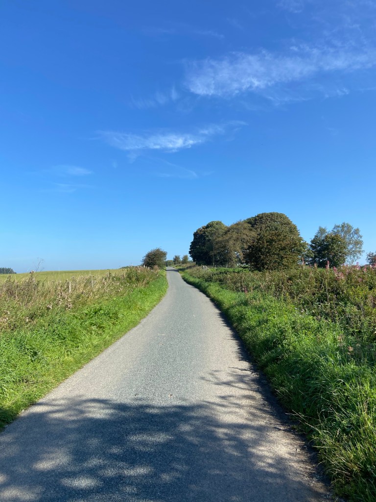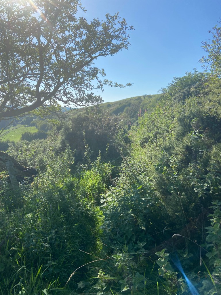 At times the path felt very well trodden, and at others times somewhat abandoned and overgrown. I even stopped to put on my long trousers at one point, as it would’ve been a literal impossibility to have battled my way past the gorse and nettles and whips of wild rose without shredding and lacerating my legs, as the wide fields gave way to enclosed tracks. Going was very slow in these sections.