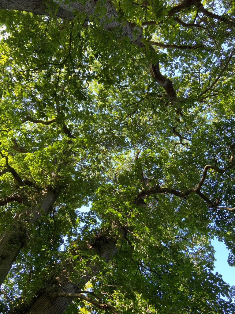 Above my head in the middle of the road a spider hung, horizontal and motionless. It had spun its web right across the road — an immense distance for a tiny arachnid. Higher above me as I looked at the spider there were butterflies fluttering high up in the oak branches, and I wondered whether they were the impressive (and apparently aggressive) purple emperors, which live in oak canopies. No way to know without binoculars. Still higher, wheeling in the air, was a young, anxious buzzard, calling incessantly. Three layers of animal life above my head.