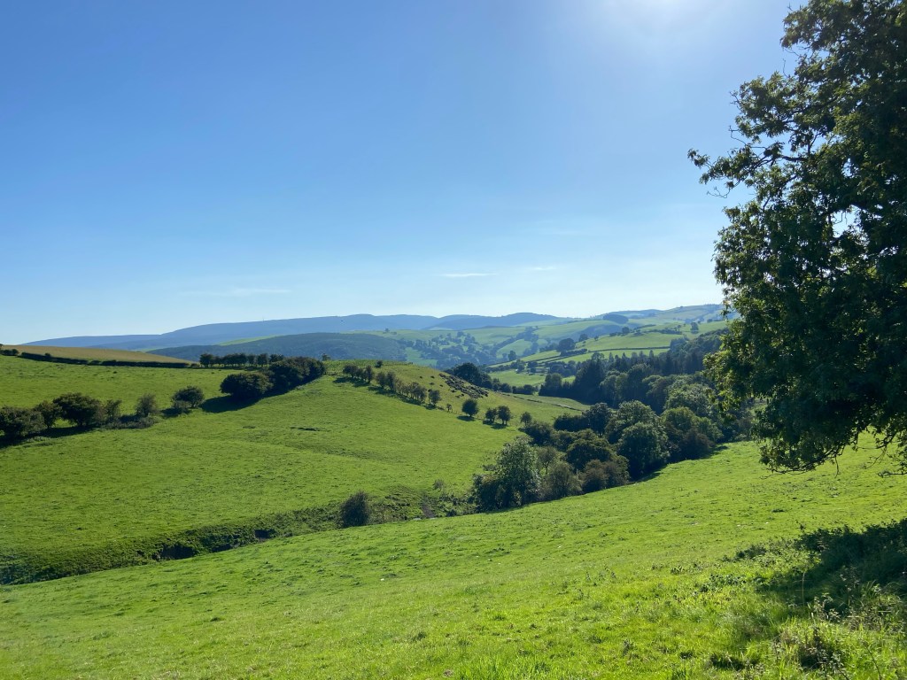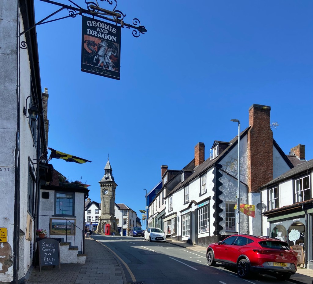 The border town of Knighton came into view as I descended, still on the road. Offa’s Dyke and the Glyndŵr Way cross here, and it was here then that my route was to cross the path of the End to End walk that Stephen and I did in 2019.