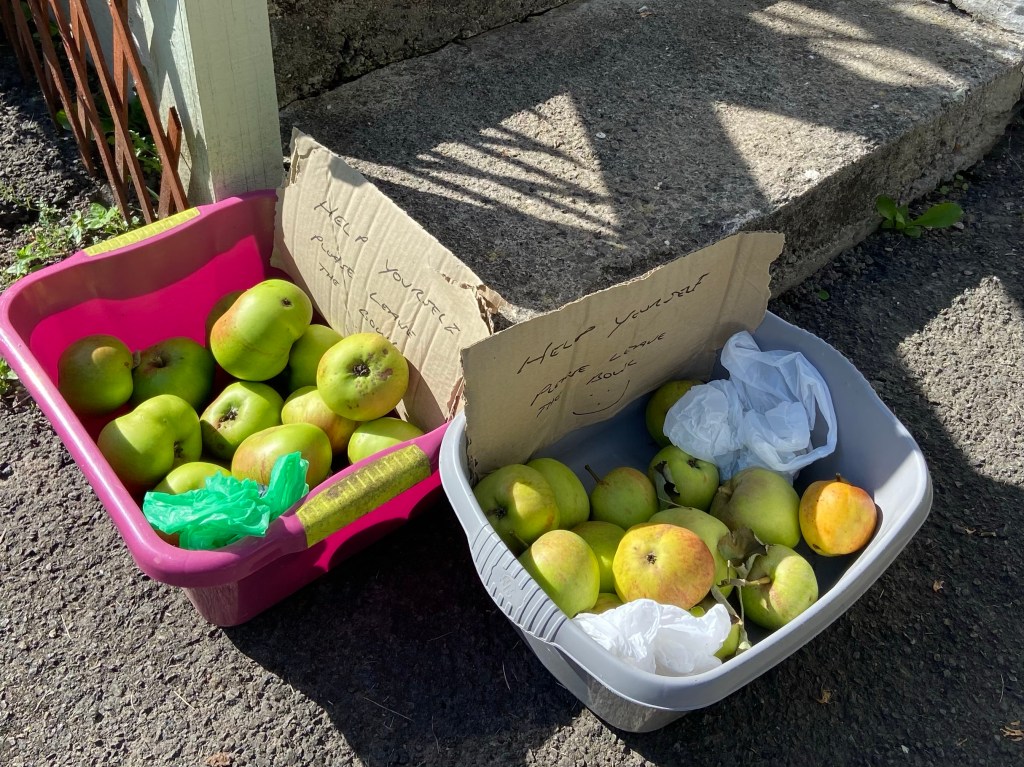 Further along the inhabitants of Hotch Potch Cottage had left out two washing-up bowls full of help-yourself apples. I gratefully did, murmuring thanks to the unknown benefactor and feeling revived by the first bite.