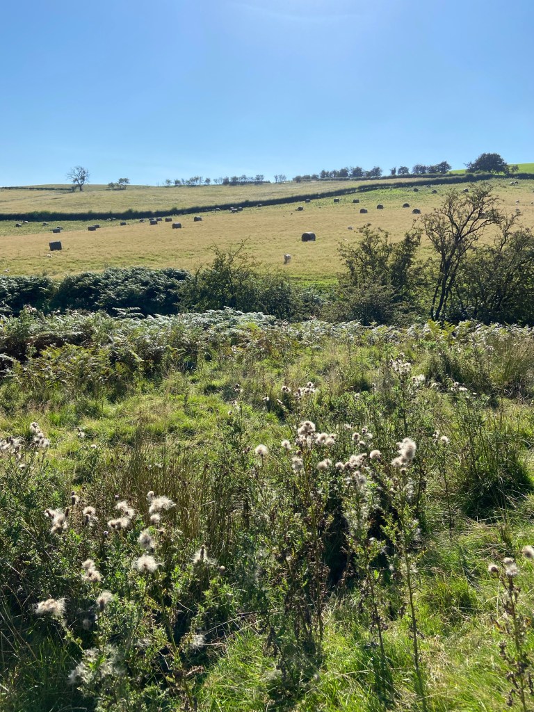 Down the path led, through a couple of hayfields. The sun was warm now, rather than hot, and cast longer, lazier shadows.