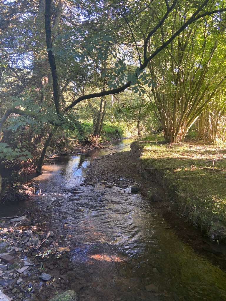 My route was to follow the Glyndŵr Way, but first I had a little pilgrimage to make, to a bench where Stephen and I sat and ate ice creams on our End to End walk. I found it, next to a little stream that is a tributary of the river Lugg which apparently I am still loosely following. I took off my pack and sat in the sun eating an ice cream I had bought in the Co-op for the purpose.