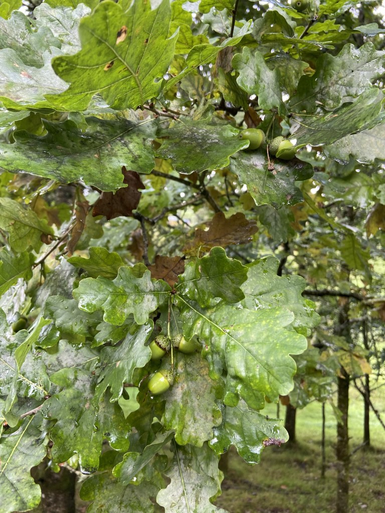 The clearing skies and the light they lent made this by far the nicest part of the walk. Every wet surface gleamed: the leaves and acorns of the oak