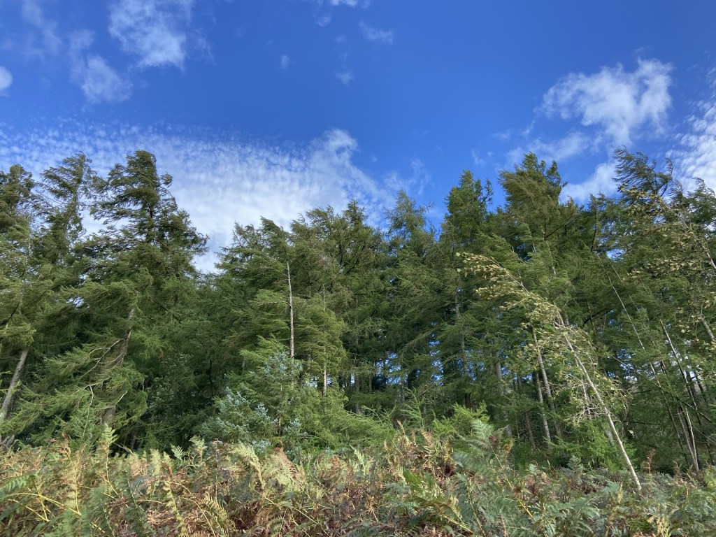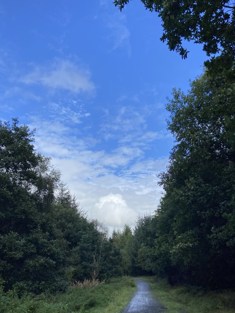 By the time I left the road for another plantation (thankfully a made-up forestry track), the sky was more blue than grey. Although I was walking in cloud-shadow, the triangular v-shape formed by the trees receding into the distance created the effect of the sky seeming to pull me forward into it.