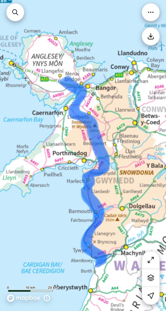 Now I walk up the coast starting in Aberdovey, past Tywyn and Harlech, with another exciting mountain crossing (but not too exciting, I hope), this one almost in the shadow of Snowdon, to descend into the Llanberis valley, and on down to the Menai Straits.