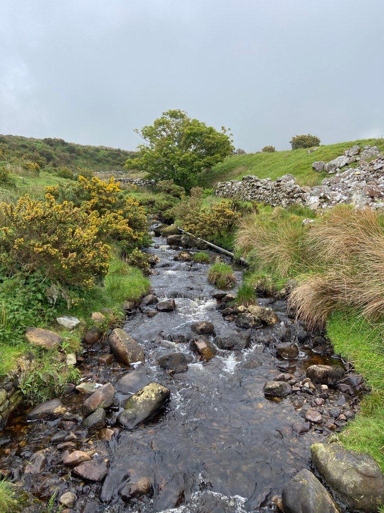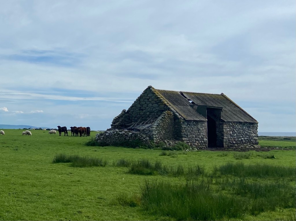 to emerge into a sheep-farming landscape that could have come straight from the Dales: sturdy dry stone walls and wind-blown hawthorns, sheep grazing in fields studded with what looked like collapsed chamber cairns.