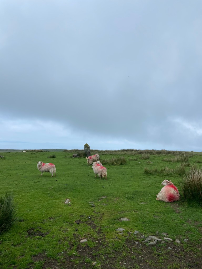 the sheep over-enthusiastically painted with the farmer’s red mark,