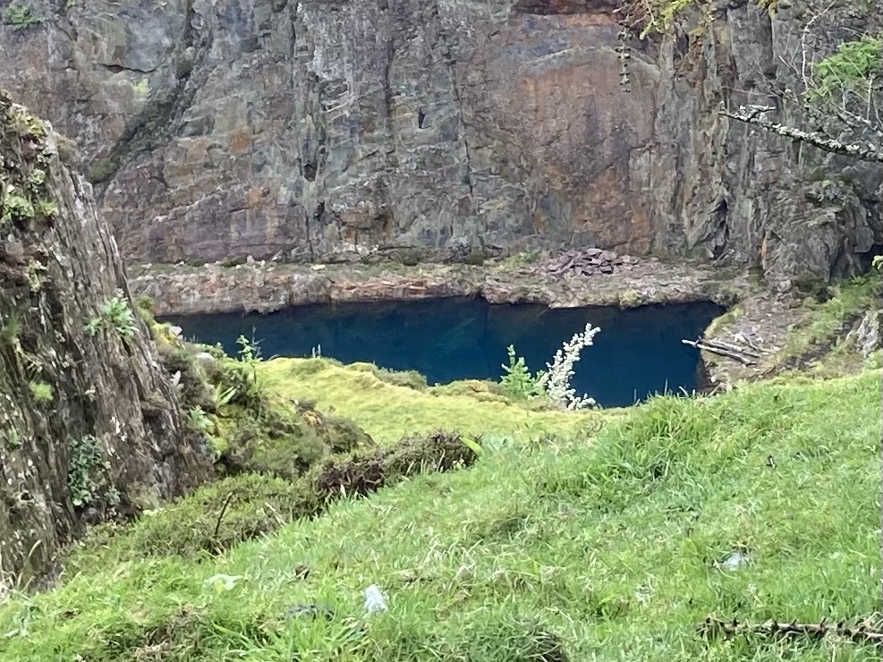 The Blue Lake fills the bottom of flooded Golwern quarry. It isn’t visible from the path; you have to climb up a steep grassy path to view it from above. I had expected the lake to reflect the grey sky (I was only going there out of dogged determination — I hardly knew why), but I was astonished to see that the water really was blue: a farmer I met much later in the day said it was copper leached into the water which turned it that colour. I haven’t been able to verify that. But it was a gem! And definitely a hidden one.