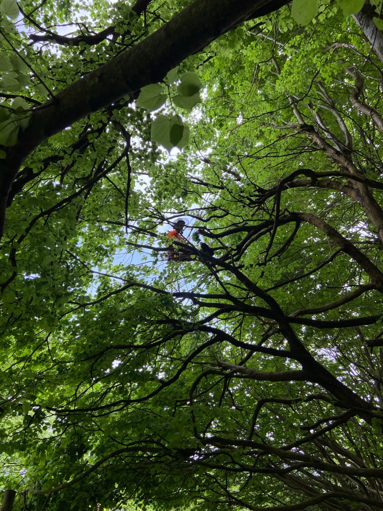 The track took me up the field edge of a high valley running parallel to the estuary. At the top end I met a team of tree surgeons pollarding a line of lime trees over the track. I couldn’t see the one up in the tree. ‘Here I am — hiding in plain sight’, he called down.