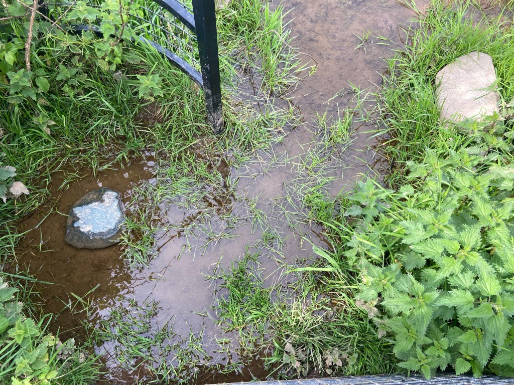 and simply impossible kissing gates. This one had the holy trinity: nettles, water and stones to whack one’s head on hard as one swings on the gate trying to avoid getting legs stung and feet soaked.