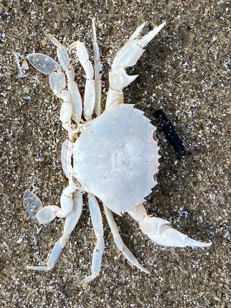 I identified this little white creature as a velvet swimming crab, and, reading up about it later was amazed to realise that crabs have ten pereiopods or legs. I think I would have bet money they had eight. Anyway, the interesting thing about the velvet crab is that the last pair of legs are flattened to help them swim instead of just scuttle like other crabs, which you can clearly see in this photo: