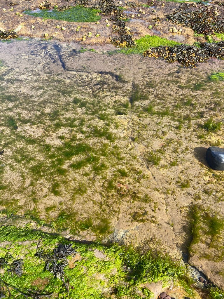 I picked my way across a lunar landscape of sand and gravel, shingle and rocks, with the beach to myself except for the crying curlews and a heron who flew away down the coast. It would have been a shame not to have looked in the rock pools. Today is a short day, after all. The shallow pools on the ancient rocky fossilised beach were perfectly limpid, just deep enough to hold a miniature grassland of seaweed.