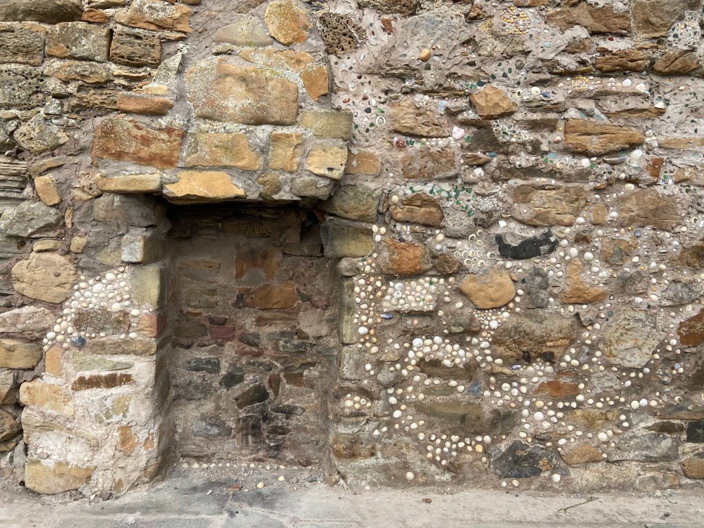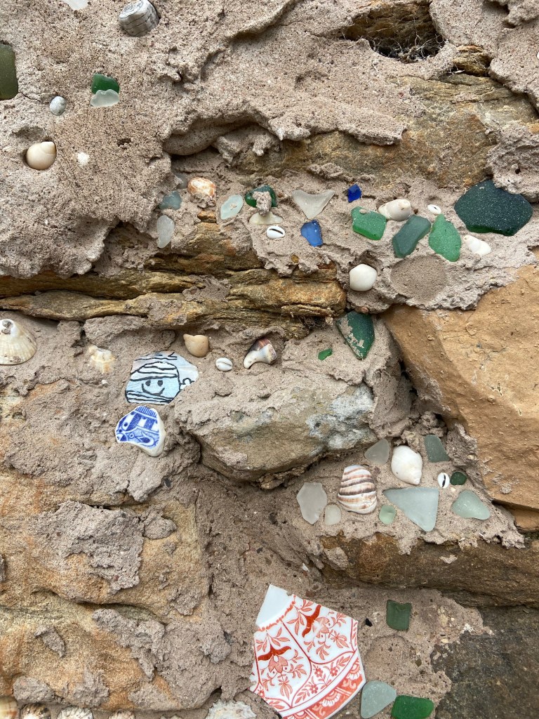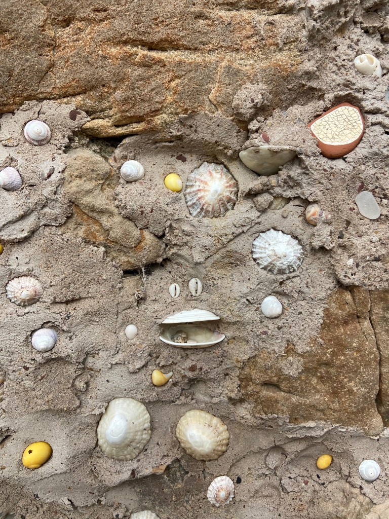 Just along from the beach was a tiny ruined cottage, slightly off the path. It looked like someone had been sticking limpets in plaster round the old fireplace, so I went to have a closer look. There were all kinds of shells and seaglass artfully pressed into wet, plaster, and the more I looked, the more I saw to make one joyful.