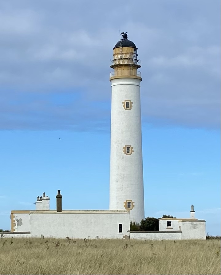 The shingle bank was more like a shingle cliff in the walk up to the Barns Ness lighthouse. The top of it was thick with tree trunks, branches and other detritus. The lighthouse is oddly the first one I have passed on land; most of them have been out to sea in the islands. A flock of starlings had made it their roost and flew in and out of the niches in the lamp, screaming and chattering.