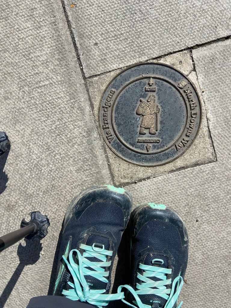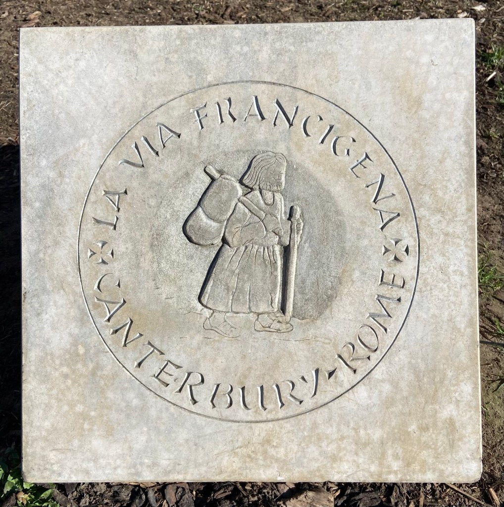 My pilgrim credential got me not only free entrance to the cathedral, but also the first two stamps in the little booklet which will be studded and stuffed with stamps collected at each day’s end by the time I get to Rome. Frances, as a local, was allowed in with her annual pass, although Stephen paid the £18 entrance fee (not grudging it, because it costs £30,000 a day to keep the cathedral going). The Canadian woman on the ticket desk (bizarrely, a recent forensic pathology graduate) took us through the gateway in person to show us where the Via Francigena starts, at a slab of stone just inside the cathedral’s main gate.  The slab is carved with a little chubby pilgrim figure, the Francigena symbol that I will follow for two thousand kilometres southwards.