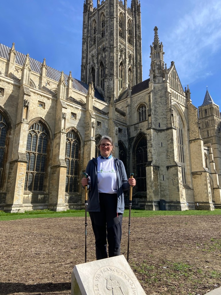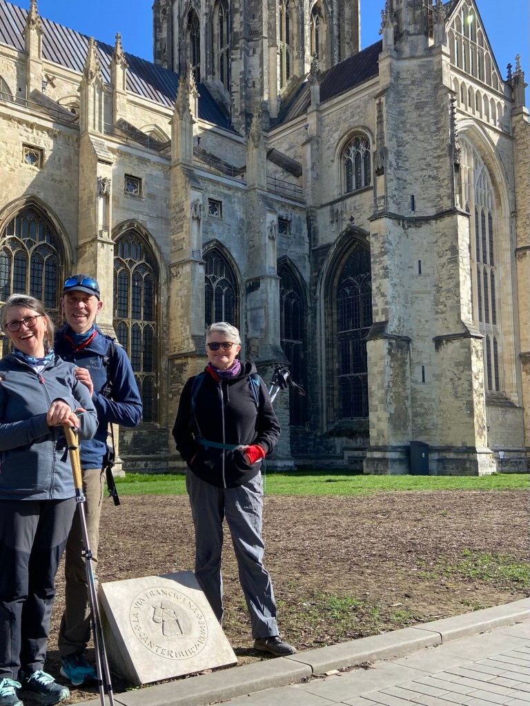We stayed last night with my cousin Frances and her family in the ancient Kentish village of Wye, and she was to walk this first day with us, keeping us company and seeing us off in style.  Her husband Gareth gave us a lift into Canterbury, and we walked towards the cathedral gate, the golden sandstone of the tower over the great crossing rising before us at the end of the cobbled street, glowing in the early morning sun.