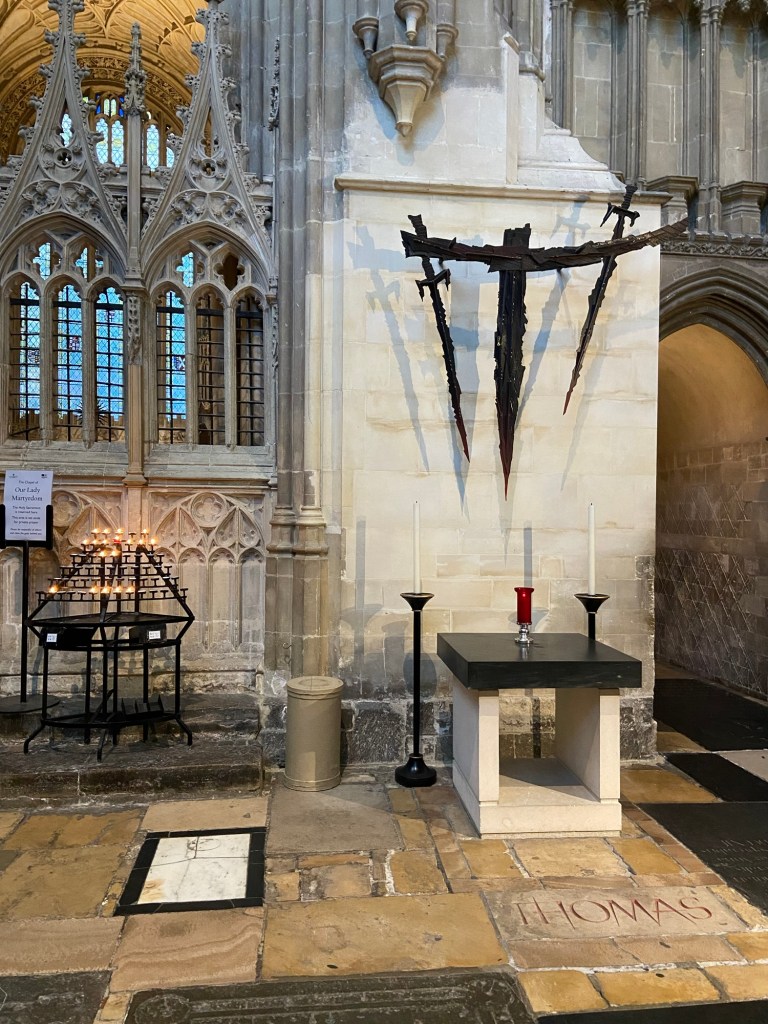 but we made our way first to the shrine marking the place where the troublesome priest Thomas à Becket was murdered in 1170. Behind an inlaid stone marker on the polished flagstones hangs a rough bronze sculpture, three jagged, stylised blades suspended above the Altar of the Sword Point.