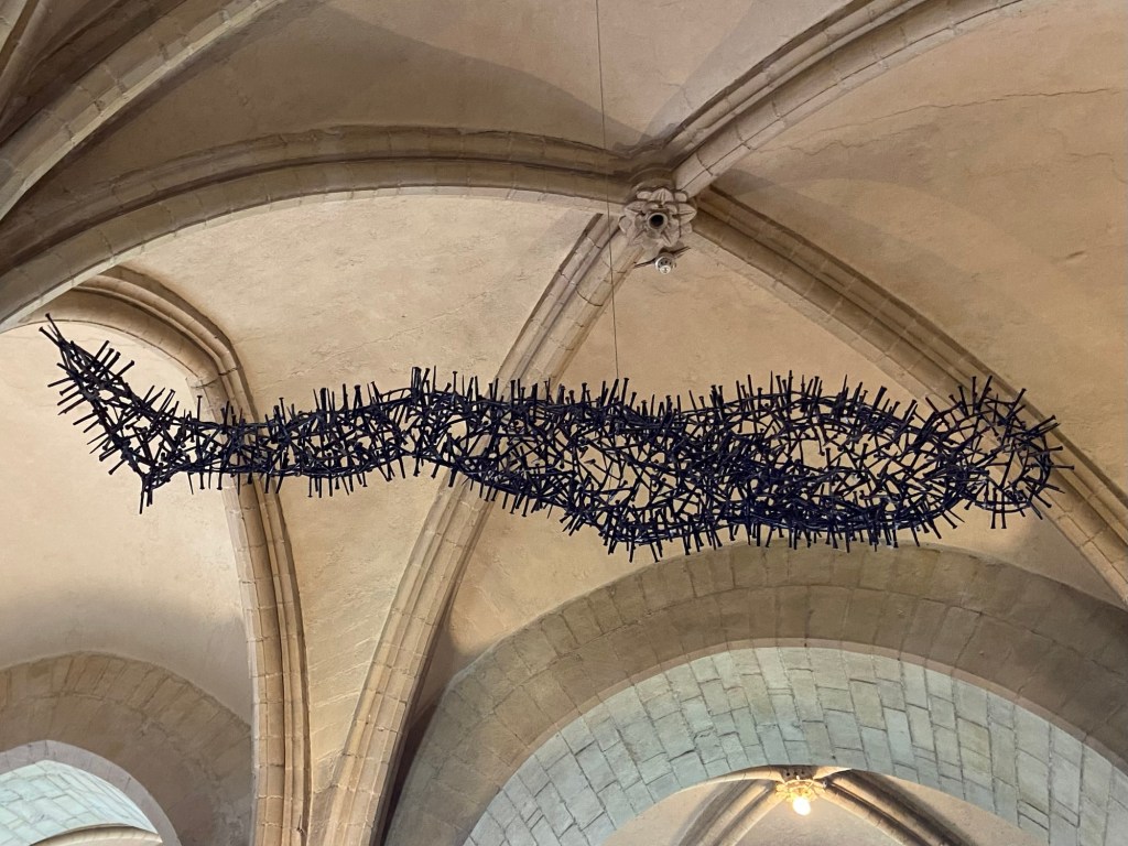 Iron nails from the Cathedral’s roof form the compelling shape of a floating body, just over two meters long. The nails pass from the outside inwards, and the inside outwards.  The sculpture is suspended in perfect balance from a single cord above the place where Thomas à Becket’s first tomb was built.