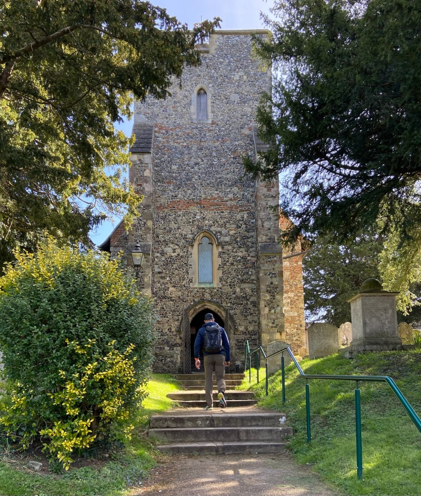 My eye was caught by the gravestone of poor Laura, of whom all that is recorded is her Christian name, and the fact that she is “WAITING” for her husband (who had several lines of description himself).  The gravestones were being industriously cleaned by an army of volunteers, the latest in 1400 years of people who have cared for and tended this church and its churchyard. They said that unfortunately we couldn’t go into the church itself because it was closed for a ‘private tour’, so we stood on the steps and admired the last view of the towers of Canterbury Cathedral, already surprisingly far away to the north-west.