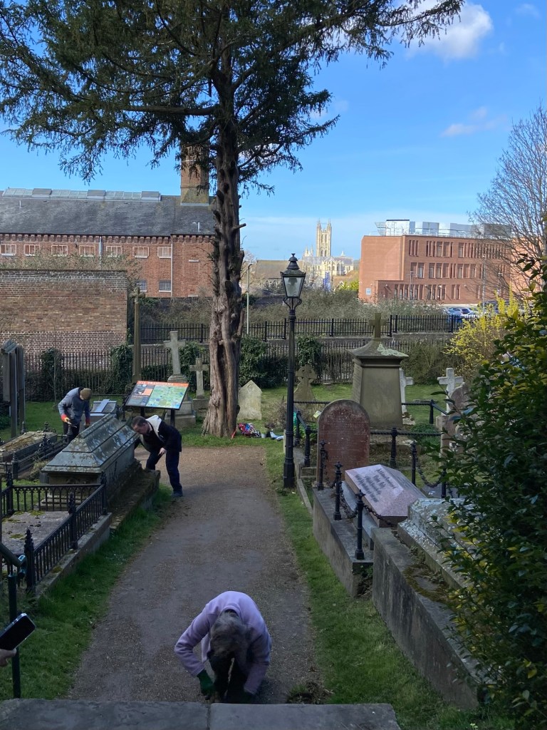 And so on outwards into the sun and air, and the cherry trees in full blossom against the freshly-cleaned stone of the Cathedral.  The entire building had been swathed in scaffolding and plastic for eight years as the cathedral underwent a £25 million restoration project, completed in 2022. We took some commemorative pictures by the stone, to mark the occasion.